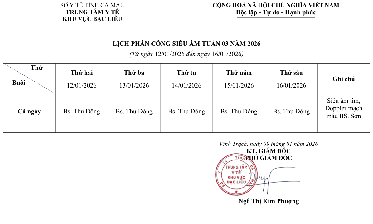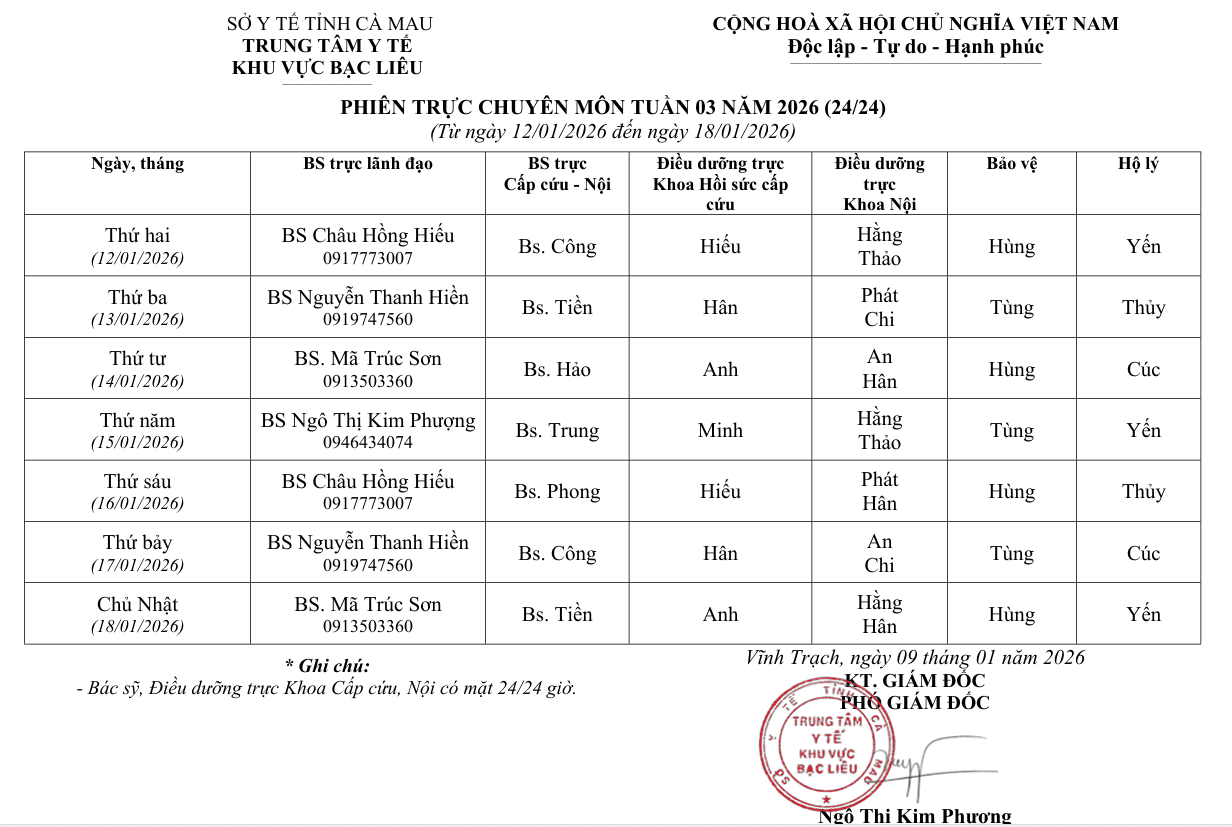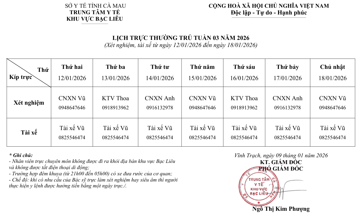 Lịch trực tuần 03 năm 2026