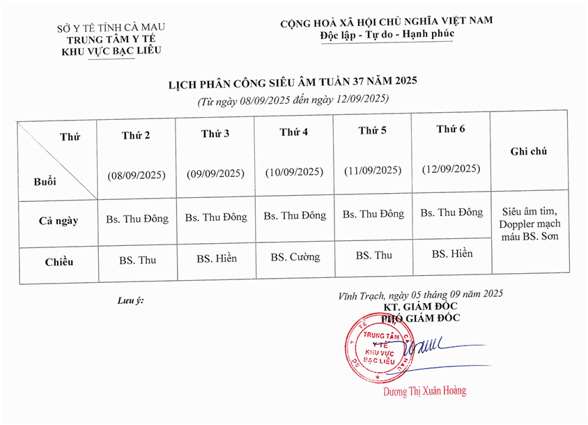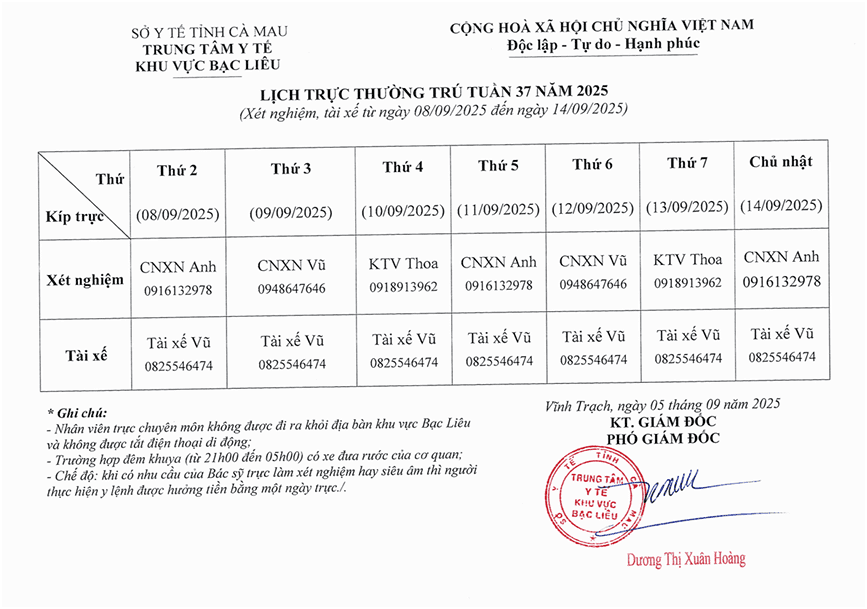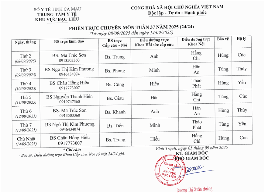 Lich trực tuần 37 năm 2025