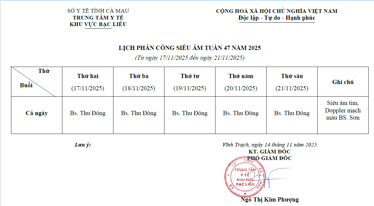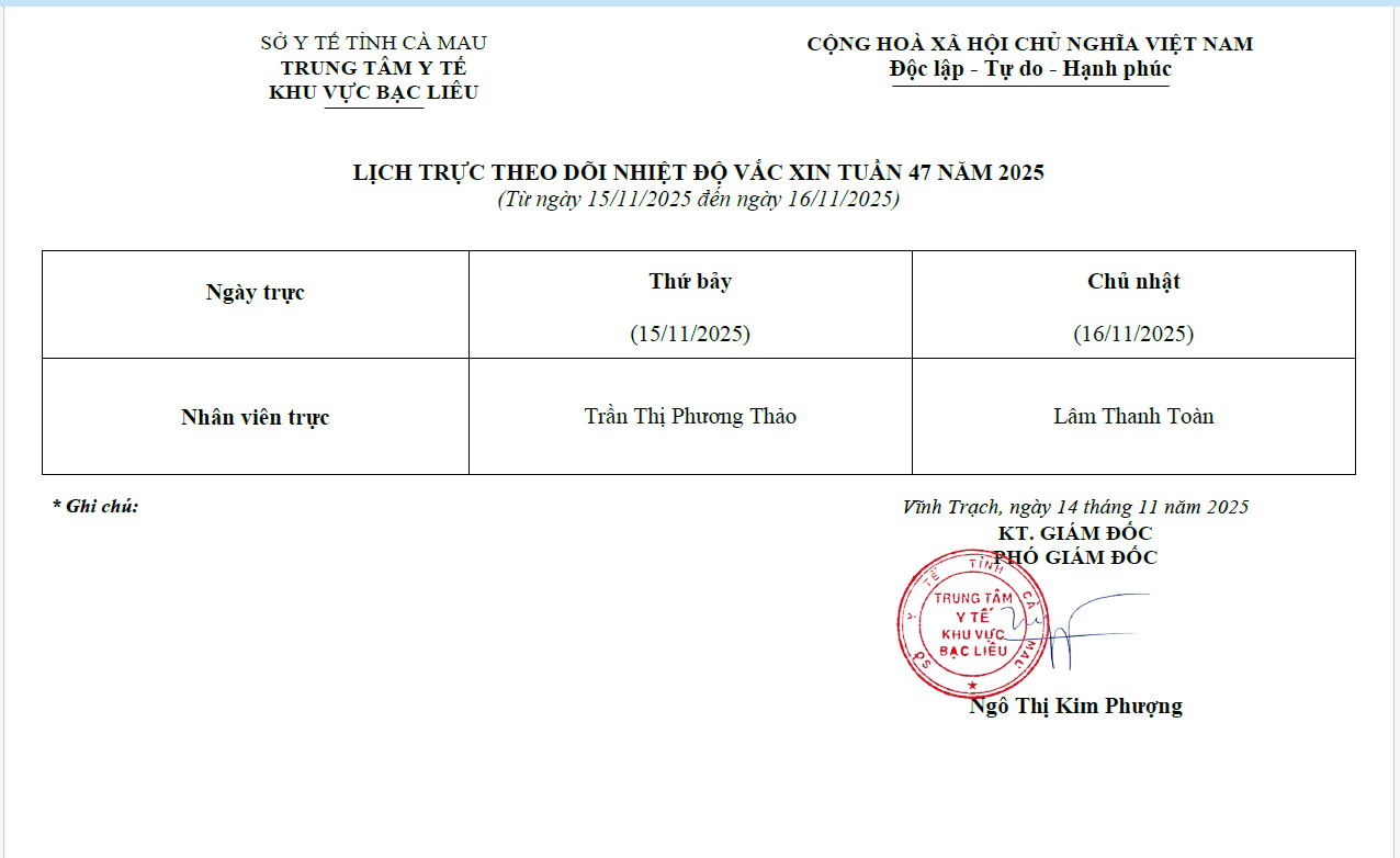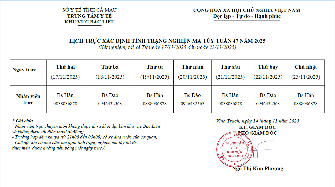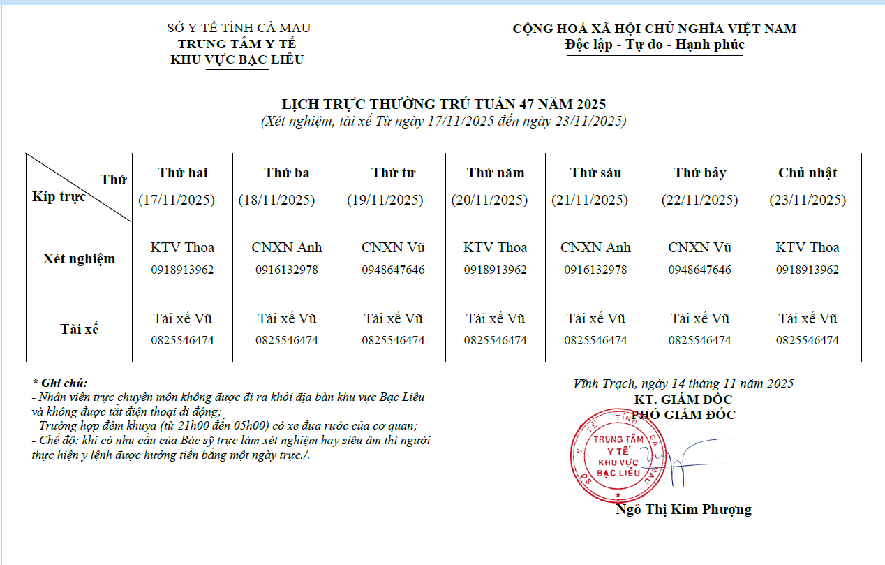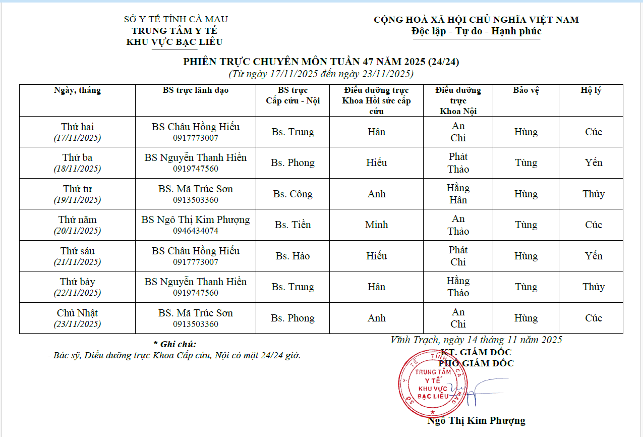 Lich trực tuần 47 năm 2024