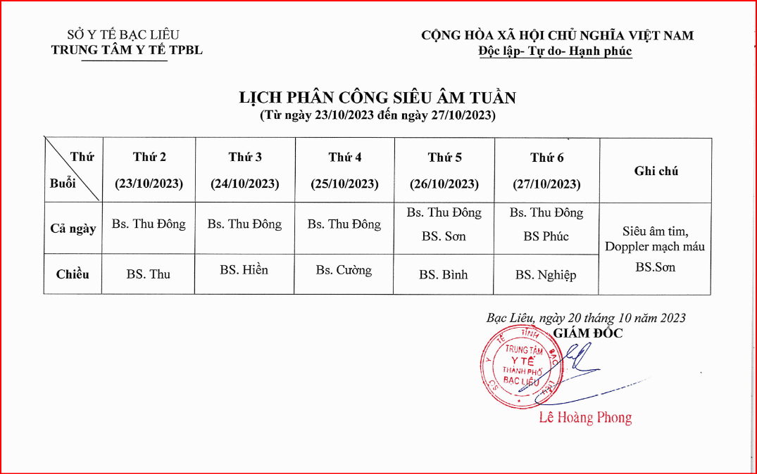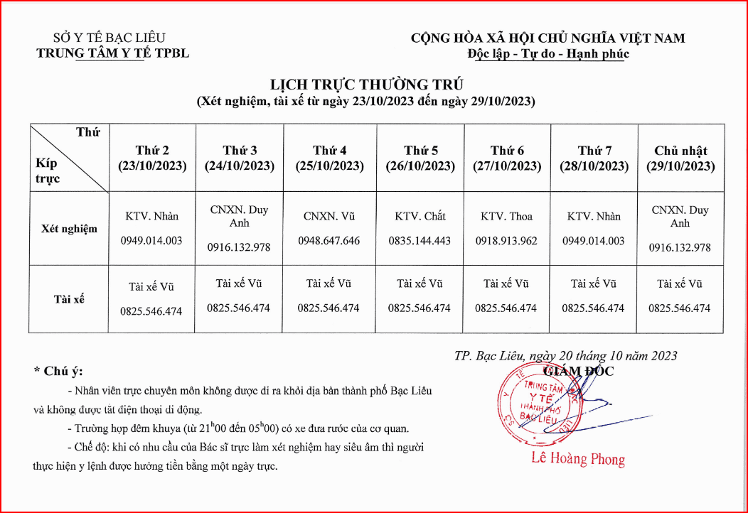 Lịch trực tuần 43 năm 2023